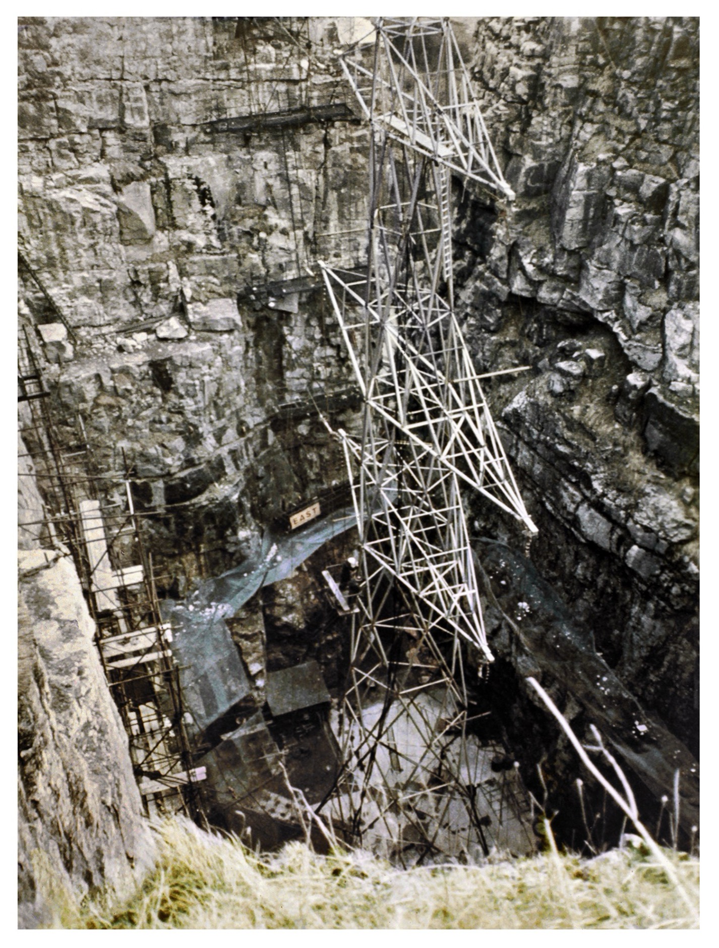 Geodetic transmission tower in 1966 in a full scale test program at the Monkey Hole test site in Derbyshire, England