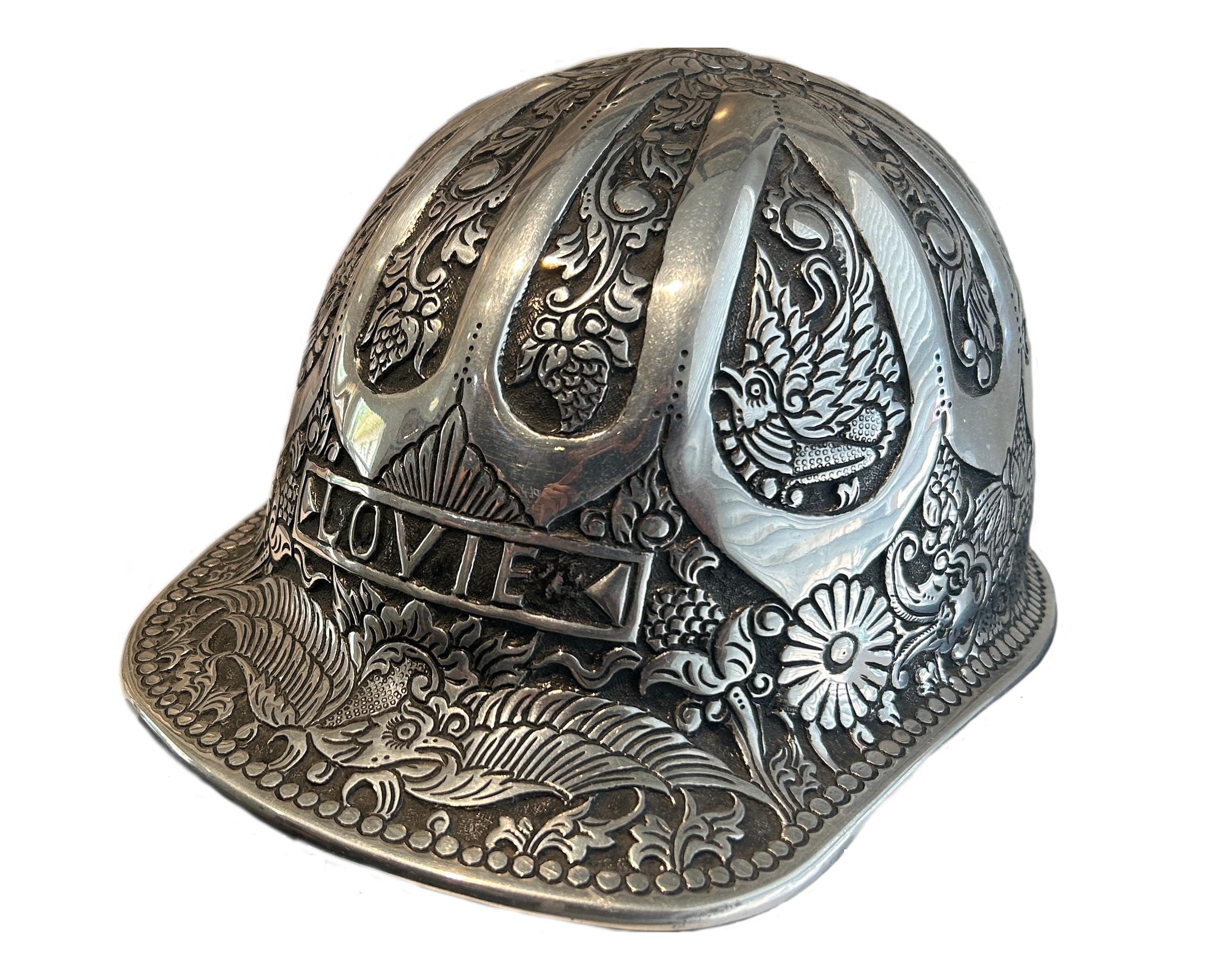Oilfield people working in Southeast Asia in the 1970s and 1980s often brought home souvenir hard hats, hammered and polished from a standard aluminum hard hat with the garuda bird symbol added: this one is by Tom Silver of Yogjakarta, Indonesia, circa 1976.